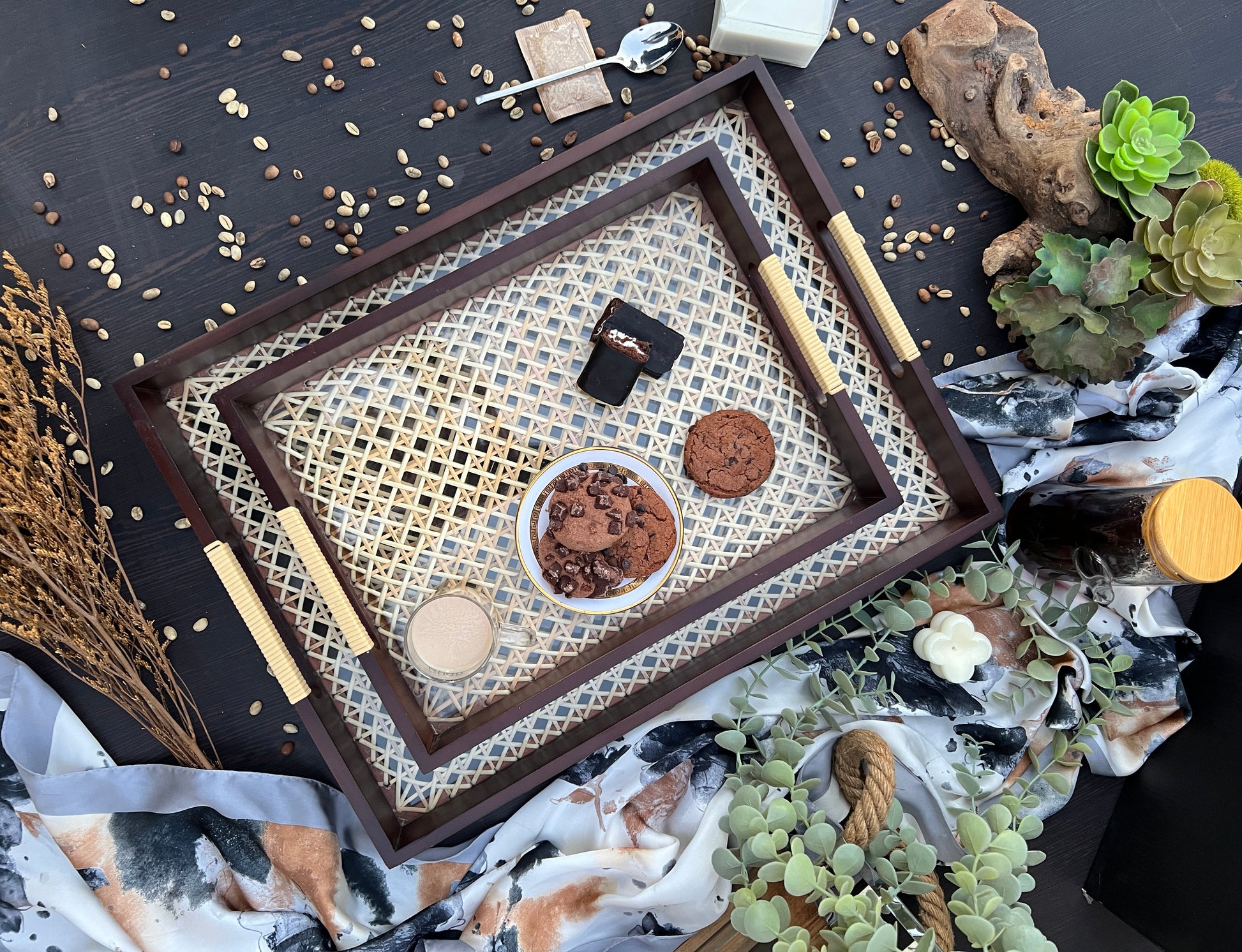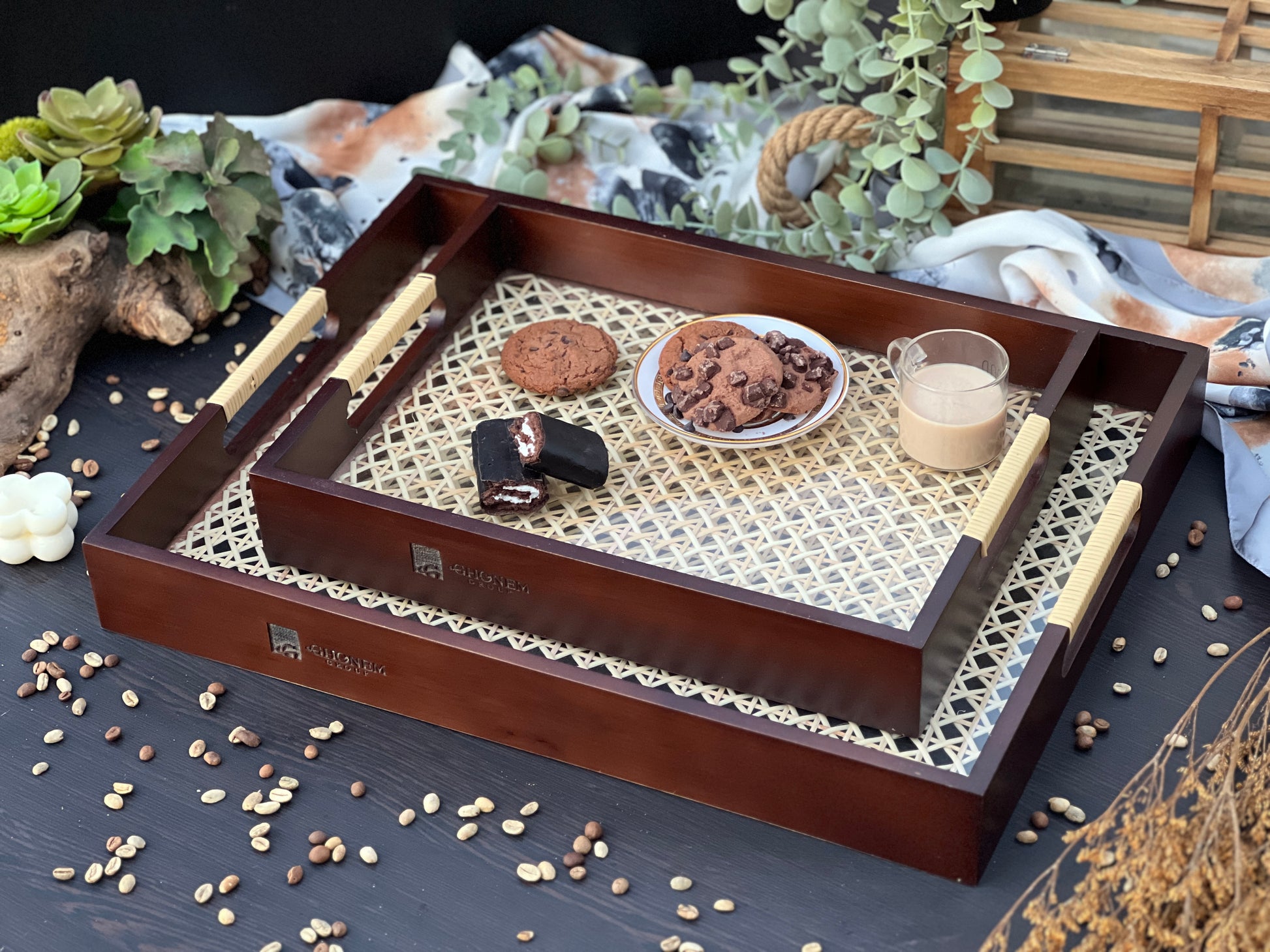 ارتقِ بتجربة تقديم الطعام مع صينية التقديم الأنيقة المصنوعة يدويًا، والتي تتميز بإطار خشبي متين وقاعدة منسوجة من قصب طبيعي. صُممت هذه الصينية بتوازن مثالي بين المتانة والأناقة، لتضفي لمسة دافئة وخالدة على أي مكان.