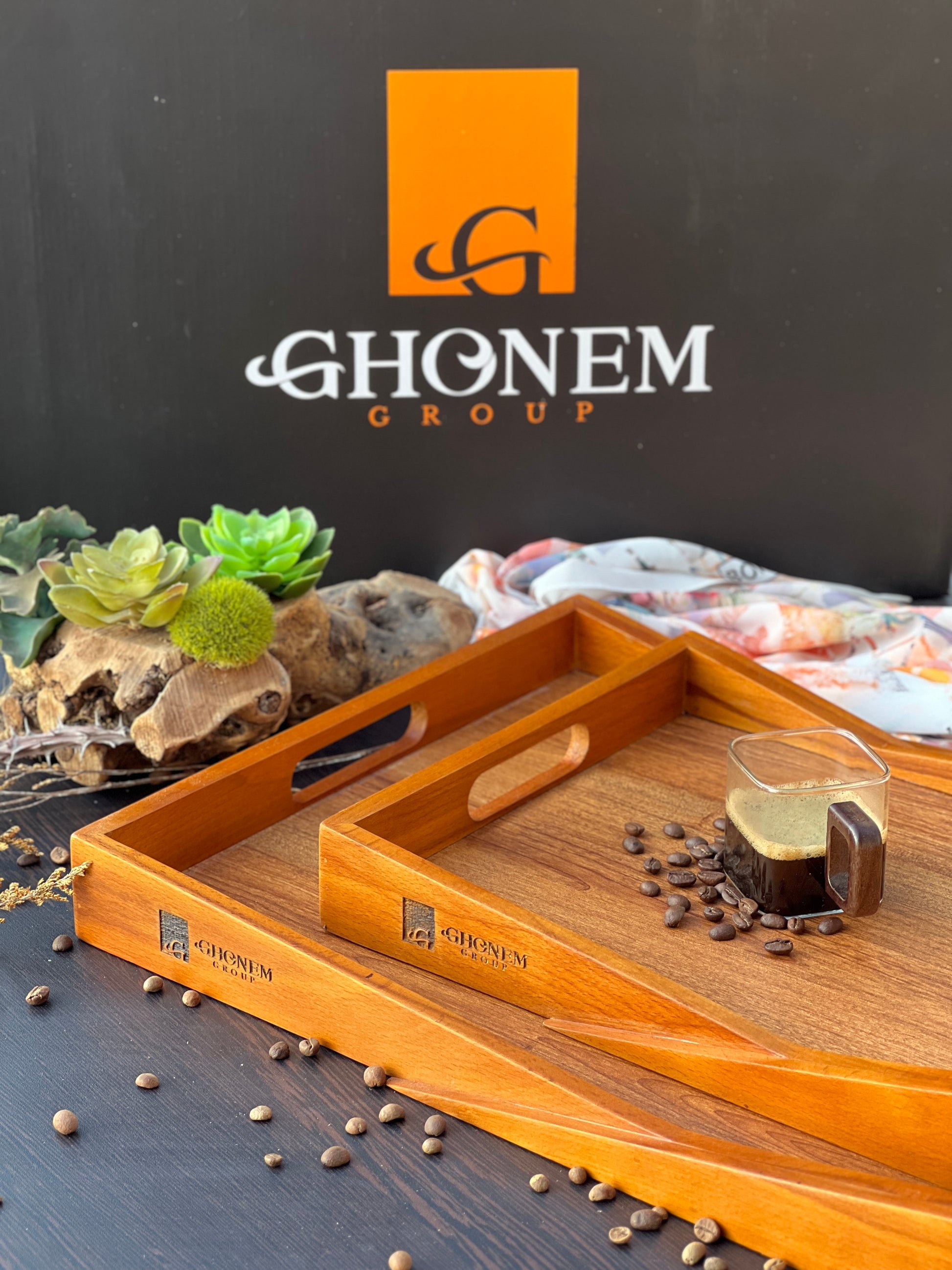 "A stylish wooden tray in a warm natural shade that brings a cozy, inviting feel. With its simple modern design and side handles, it’s easy to carry and perfect for daily use. Ideal for serving your morning coffee or welcoming guests, while adding a natural charm to any corner of your home."