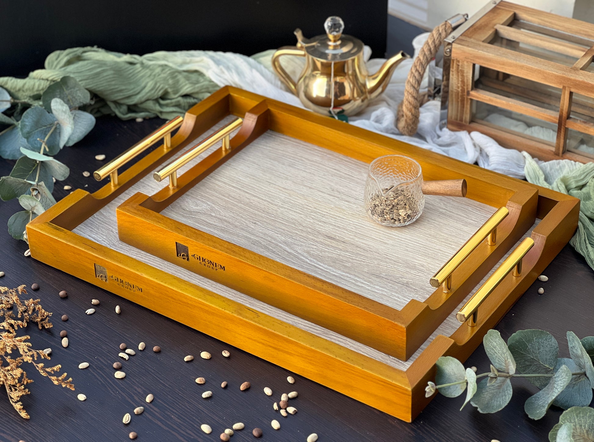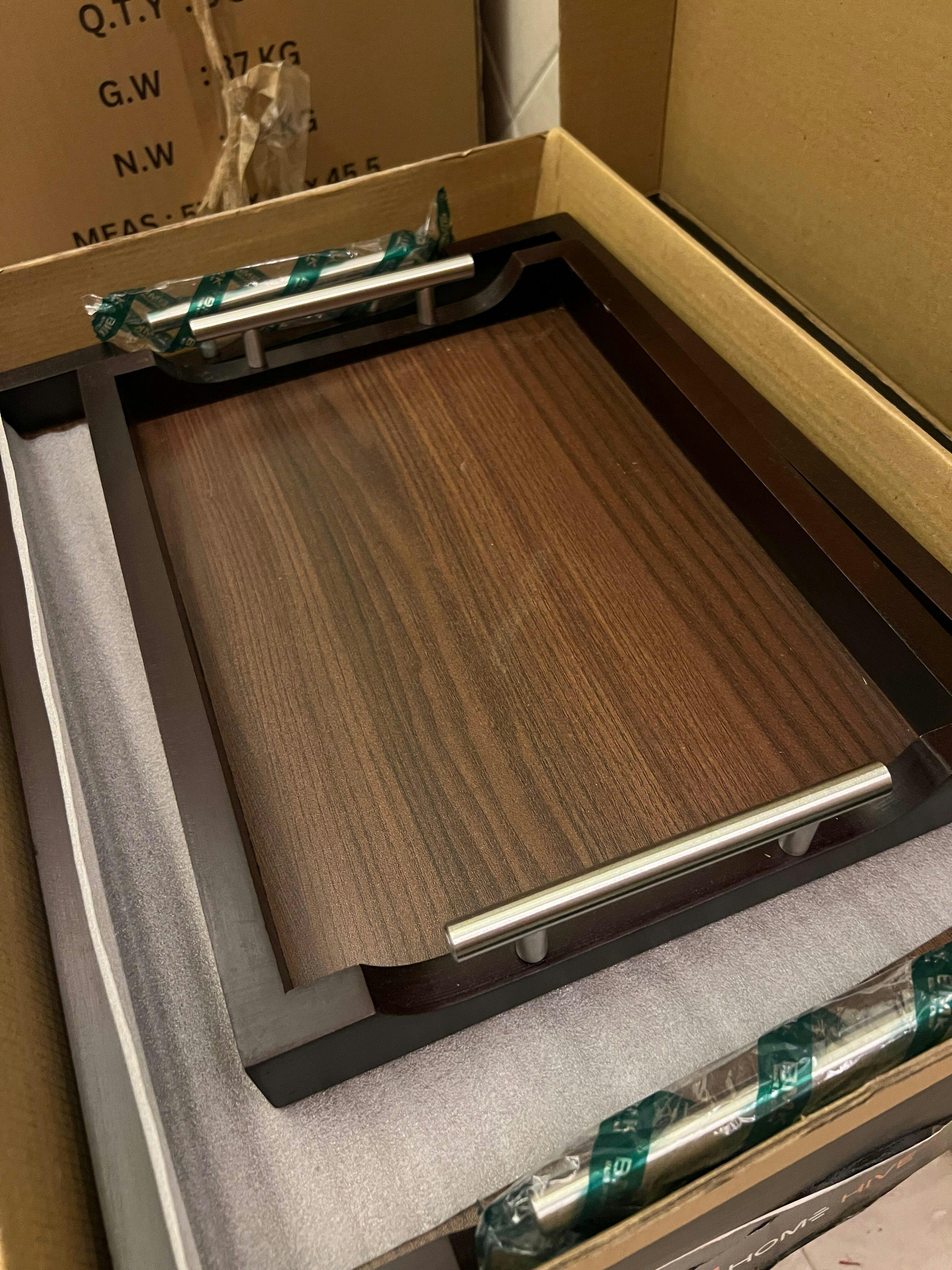 "An elegant wooden tray with sturdy metal handles that add a modern industrial touch. The blend of natural wood and metal creates a unique balance of strength and style. Perfect for everyday serving or as a decorative piece that enhances any contemporary space."